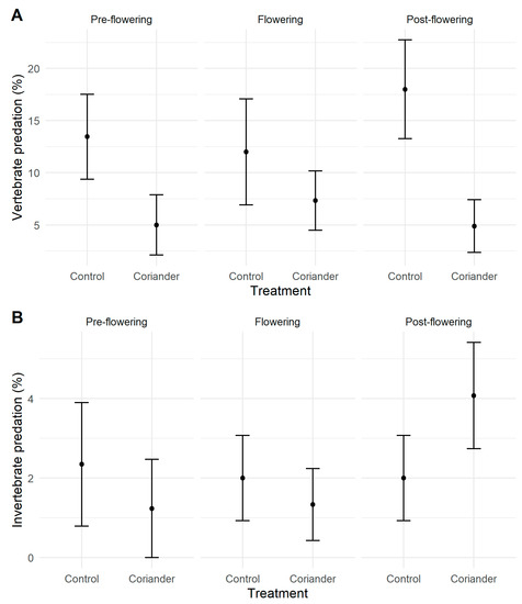 Vertebrate (A) and invertebrate (B) predation rates in coriander and control strips in Azorean orchards. Points are means; vertical lines indicate ± SE.