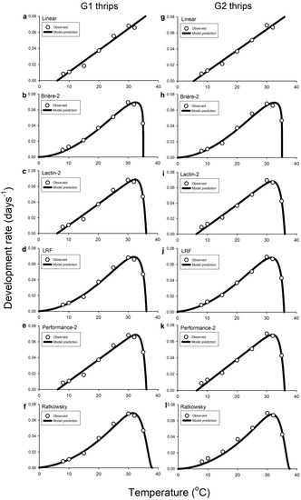 - Shi, P.; Ge, F. A comparison of different thermal performance functions describing temperature-dependent development rates. J. Therm. Biol. 2010, 35, 225–231. [Google Scholar] [CrossRef]