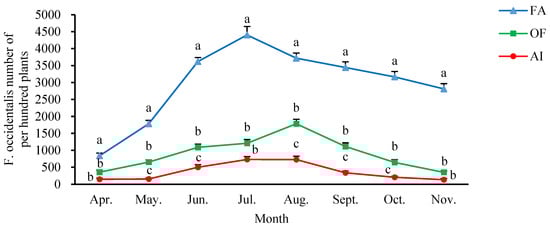 This study presents the population numbers of F. occidentalis in three different habitat conditions from April to November 2021, as shown in Figure 1. The trend indicates an initial increase followed by a decrease. The population numbers of F. occidentalis in different habitat conditions during the same period followed the order of FA > OF > AI. Interestingly, F. occidentalis showed similar distribution patterns with varying peaks under a variety of different habitat conditions. In July, the highest peaks of F. occidentalis were 4404.00 ± 248.09 and 732.00 ± 89.10 per hundred plants collected from FA and AI, respectively. The peak of 1784.00 ± 133.797 per hundred plants collected from OF appeared in August.