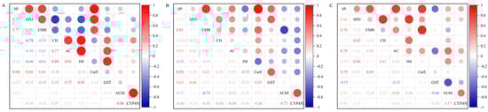 Correlation between resistance ratio (SP, spinetoram; SPD, spinosad; EMB, emamectin benzoate; CH, chlorfenapyr; AC, acetamiprid; IM, imidacloprid) and activities of detoxifying enzymes (CarE, carboxylesterase; GST, glutathione S-transferase; AChE, acetylcholinesterase; CYP450, cytochrome P450 enzyme system) in FA (A), OF (B), and AI (C) populations of F. occidentalis. Blue circles represent negative correlations and red circles represent positive correlations between six insecticides. The larger circles represent the stronger correlation. Red numbers represent positive correlation coefficients. Blue numbers represent negative correlation coefficients. Darker shades of the same color represent higher correlation coefficients.