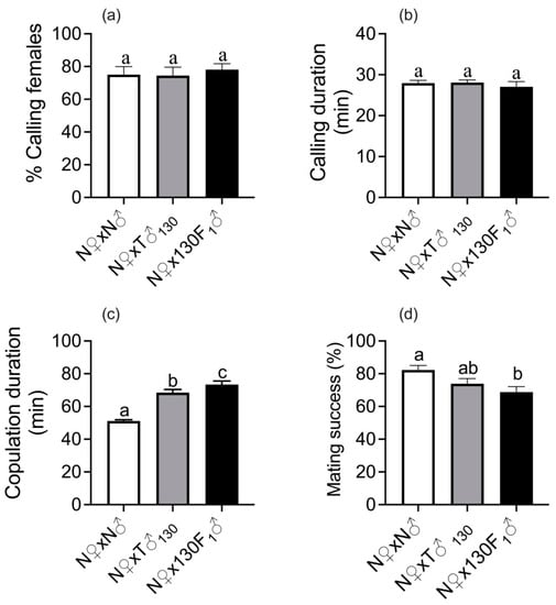 Females initially mated with F1 males called for significantly longer during the second mating than the unirradiated controls (females that were first mated with an unirradiated male). Further, calling duration during second mating increased proportionally with increasing in inter-mating intervals (24 h, 48 h or 72 h) in both the regimens, involving first mating with an irradiated male or an F1 male (N♀ × T♂130 × N♂ and N♀ × F1♂ × N♂); the impact was greater in the latter case.