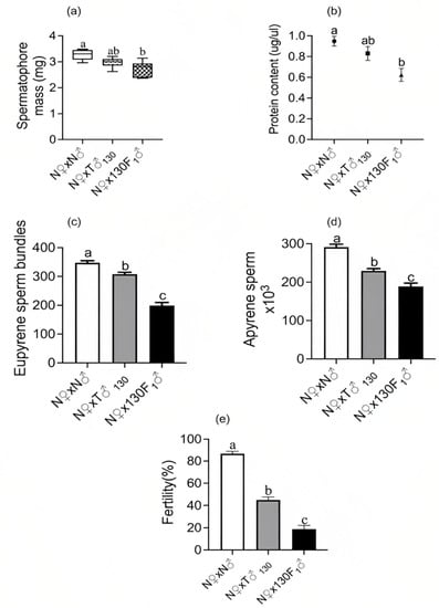 For this study, the unirradiated females (N♀) were paired with irradiated male moths (N♀ × T♂130), F1 males (derived from a cross of irradiated males and unirradiated females) (N♀ × 130 F1♂) and unirradiated male moths (N♀ × N♂) in different regimens. Upon termination of copulation, the females were removed and kept in a freezer before extraction of the spermatophore from the female’s bursa copulatrix. The fresh weights of the spermatophores were weighed and each one was put into an individual plastic 0.2 mL Tarson Eppendorf tube. The tubes containing the ejaculates (extracted from the spermatophores) were transferred to a freezer (LG 437) where they were stored at −20 °C. The ejaculates were assayed for their protein concentration using the BCA Protein Assay Kit (Thermo Fisher Scientific, Wilmington, DE, USA, Cat. No. 23225) [48] with bovine serum albumin (BSA) as a standard.