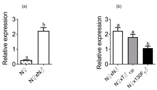 Effect of irradiated males and their F1 male progeny on SPR expression in mated females. (a) Relative gene expression in females before and after mating with normal (unirradiated) males, (b) relative gene expression in females after mating with treated males (irradiated males or their F1 male progeny). Means ± S.E followed by same small letters are not significantly different at p < 0.05 level; (a) t-test, (b) one-way ANOVA followed by Tukey’s post hoc test. N♀—unirradiated female, N♂—unirradiated male, T♂130—male irradiated with sub-sterilizing dose of 130 Gy, and 130 F1♂—F1 male progeny derived from sub-sterile male.