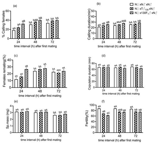 In the unirradiated control group (N♀ × N♂ × N♂), the sequential matings of unirradiated females with unirradiated males showed that 18% of the mated females exhibited calling behavior for remating at 24 h after initial mating. This proportion of calling females was significantly increased when the interval between the two consecutive matings was increased to 48 h (~31%) and 72 h (~34%). In a mating cross of N♀ with a T♂130 followed by a second mating with an unirradiated male (N♂), and in a mating cross of a N♀ with a 130 F1♂ followed by a second mating with N♂, the proportion of females calling was also significantly increased with an increase in the interval between two consecutive matings. The increase in the proportion of females calling was influenced by the male irradiation status involved in first mating, with the impact being greater in the regimen of N♀ × 130 F1♂ × N♂, where F1 males were crossed with unirradiated females (Figure 4a).