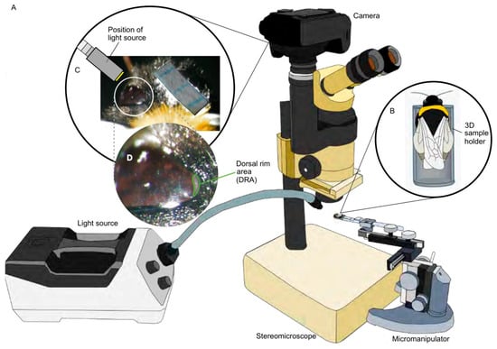 Set-up and equipment for the dorsal rim area (DRA) image acquisition in 2D. (A) microscope set-up to acquire DRA photographs, (B) bumblebee in sample holder, (C) light set-up for DRA visualization, (D) enlarged view of the DRA.