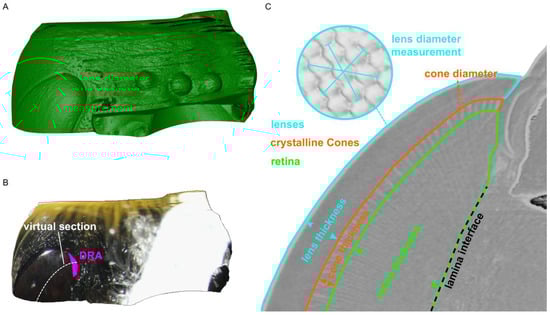 The compound eyes from the six individuals that had their DRA localized and segmented were also used for volumetric analysis. The three chosen regions for ommatidial structure comparisons were within the DRA, proximate to the DRA (five ommatidial rows surrounding the DRA), and non-DRA (>20th ommatidial row vertically from the DRA). Seven longitudinal virtual histological slices consisting of the three regions were obtained per eye from the 3D scans using the clipping plane module in Amira. Only virtual slices where the rhabdoms were continuous were used for further analysis (Figure 2C). Virtual histological slices were exported and analyzed in FIJI (Version 1.8.0_172) [65]. The thickness of the lens, crystalline cones, and rhabdoms, as well as the width of the crystalline cones were measured. The lens width was measured externally on the model using 3D line tools (Figure 2C). For each of the six eye samples, 20 ommatidial structure measurements were performed.