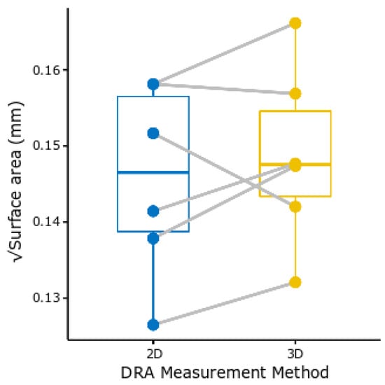 Boxplot comparing 2D and 3D DRA surface area measurements taken from the same individuals (grey lines) of Bombus terrestris. There was no significant difference between the values acquired using the 2D images or 3D volumes (t = −1.0421, p = 0.3451, n = 6, Wilcoxon signed-rank test).