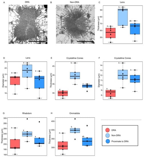 Transverse sections of (A) DRA, and (B) non-DRA microvilli obtained from transmission electron microscopy (TEM) (n = 1). Ommatidial structure comparison between DRA, proximate to the DRA and non-DRA regions. Thickness of lens (C), crystalline cones (E), rhabdom (G), and ommatidia (H). Diameter of lens (D), and crystalline cones (F) (n = 6). Letters represent the outcome of pairwise Wilcoxon rank sum tests, matching letters indicate no significant difference at p ≥ 0.05 and non-matching letters indicate significance below this value. Scalebar: 1 μm.