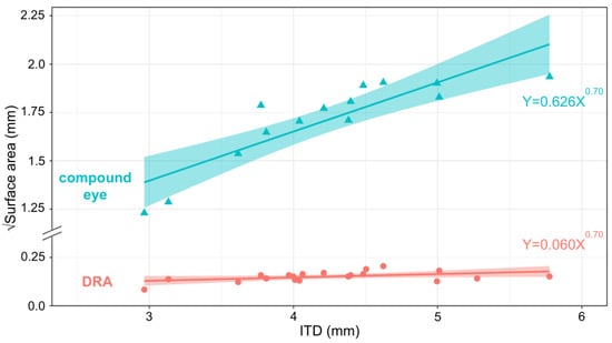 Since the two methods used for determining the DRA surface area yielded very similar results (Figure 3), the surface area measurements of the DRA from the 2D photos were used for the allometric analysis of how DRA surface area varies with the compound eye surface area (n = 20). The surface area of the compound eyes was obtained from the 3D compound eye models (n = 14). All variables were converted to linear measurements before logarithmic transformation. The relationships between the surface area of the DRA and compound eyes were plotted against ITD onto a log–log plot.