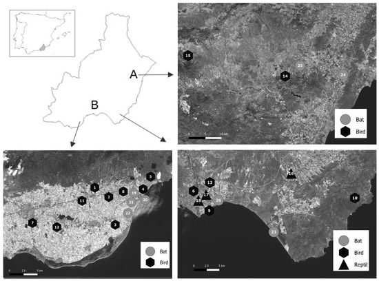 Location of samples of feces from birds, reptiles, and bats. Upper left: location of the province of Almeria in South–East Spain and two areas within (A: East and B: Southeast). Numbers refer to collected samples.
