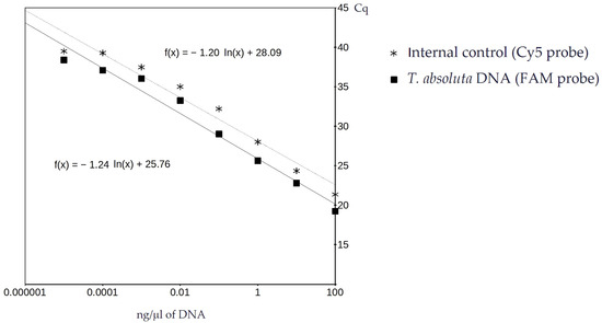 A group of 10 T. absoluta individuals were ground in 400 µL Chelex solution (5%) and treated as described below. The assay sensitivity was tested by running serial dilutions of this T. absoluta DNA through the real-time PCR assay. DNA concentrations from 100 ng/µL to 0.0001 ng/µL were run using both the detection and control probes. Dilutions were prepared by adding appropriate amounts of water to a known starting concentration of DNA. The results of three independent runs were averaged and the quantitation cycle (Cq) values were compared to DNA concentration on a logarithmic scale to determine the slope, y-intercept, and correlation effects of DNA concentration on assay sensitivity [23].
