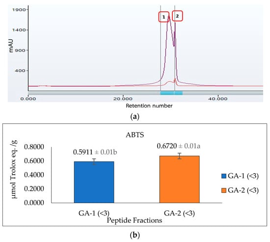Glutelin was further purified through a series of purification stages. In this context, glutelin was passed through membrane ultrafiltration to obtain <3 kDa, 3–10 kDa, and >10 kDa microcon. The ABTS radical-scavenging activity and metal-chelating activity of the glutelin fractions were determined for the most active fraction. Glutelin samples hydrolyzed with Alcalase (GA <3 kDa) had the highest ABTS activity with 0.45 µmol Trolox eq./g while GA (>10 kDa) had the highest metal-chelating activity with 1322.38 µmol EDTA eq./g (p < 0.05), as shown in Figure 6. There is speculation that the high antioxidant activity of GA (<3 kDa) and GA (>10 kDa) is a result of the binding ability of the ultra-filtered fractions, their high amino acid composition, and their containing high amounts of hydrophobic amino acids [51]. Previous research has shown that the lowest peptide fractions with the lowest molecular weights are often the ones with the highest bioactivity. This can be attributed to the presence of simple peptide sequences that allows the binding of functional groups to target protein or free radicals [52]. GA (<3 kDa) and GA (>10 kDa) were selected for further purification using size exclusion chromatography because they both had the highest ABTS antioxidant activities and metal-chelating activities.