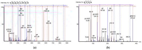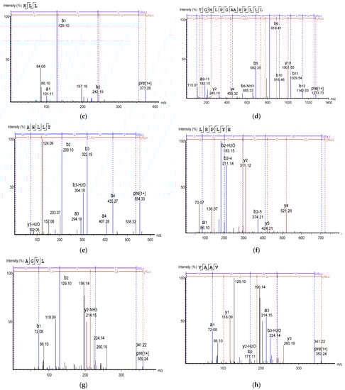 Table 2 shows the identified antioxidant peptides from the glutelin hydrolysate fraction of cricket protein. The sequences found in GA-1 (<3 kDa) were TEAPLNPK, EVGA, KLL, TGNLPGAAHPLLL, and AHLLT, while those found in GA-2 (<3 kDa) were LSPLYE, AGVL, VAAV, VAGL, and QLL. Figure 8 represents the mass spectra of 10 selected antioxidant peptides, and the molecular weights of the peptides were within the range of 359.23–721.37 Da. Moreover, the mass spectra of the ions aligned with the ions in the mascot database, indicating the accuracy of the database. All the peptides identified contained hydrophobic and essential amino acids including alanine, leucine, and valine. Overall, the hydrophobic amino acids in the identified peptide sequences ranged from 50–100% of the whole amino acid in the sequence. It has been reported that peptide sequences with hydrophobic amino acids and aromatic amino acids exhibit strong antioxidant potential [57], and that a larger number of amino acids such as Gly, Pro, and Leu accounts for the total amino acid content in bioactive peptides [56]. Hydrophobic amino acids can enhance peptide solubility and scavenge free radicals [58]. The peptides from GA-2 (<3 kDa) contain tyrosine, valine, and leucine, which explains its high antioxidant activity. Many bioactive peptides are closely related to their amino acid composition, which allows them to donate hydrogen or electron to undergo radical scavenging activities [59]. Sae-Leaw et al. [60] observed that a high level of hydrophobic amino acids with repeating Gly-Pro sequences in peptides derived from gelatin hydrolysate of seabass skin possessed high ABTS radical-scavenging activity. In this study, they identified peptide chains with 5–12 amino acids containing hydrophobic amino acids in concentration of between 50–100%, which correlates with the findings of the present study. Amino acid sequences containing hydrophobic amino acids like alanine, valine, and leucine have strong antioxidant activity against attacks and contribute to improving peptides’ bioactivity [59,61]. Najafian and Babji [62] revealed, in their identification of bioactive peptides from Pangasius sutchi, that proline, valine, histidine, and aspartic acid are present in the peptides identified. Their study also showed that valine and leucine are types of hydrophobic amino acids that can enhance peptides in water–lipid interaction to facilitate free radical-scavenging activity. The prevalence of hydrophobic amino acids in the amino acid sequence of a peptide increases their antioxidant activity [44]. Intarasirisawat et al. [19] emphasized the effect of hydrophobic amino acids in antioxidant peptides, noting that the hydrophobic amino acids making up between 50–100% of the identified peptides from skipjack (Katsuwana pelamis) roe exhibited high ABTS radical-scavenging activity. However, they also found that the peptide sequence with the highest hydrophobic amino acid portion (up to 80% (MLVFAV)) exhibited low ABTS radical-scavenging activity. This was probably due to the improper configuration of the peptide to scavenge ABTS radicals.