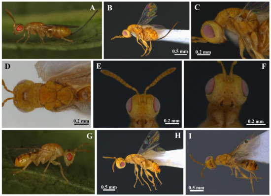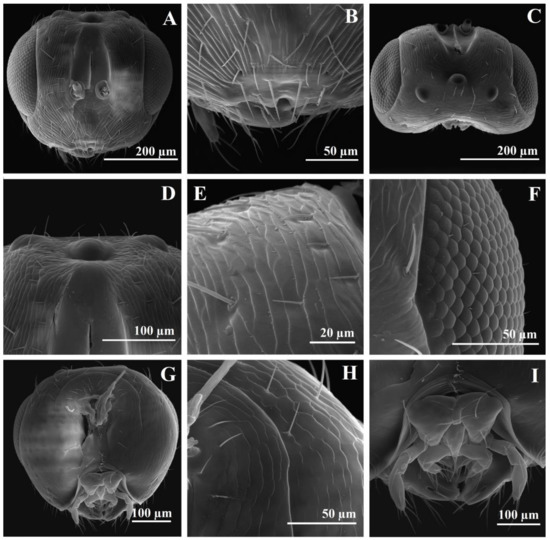 Figure 3A,D,F–H). The head color is light yellow, pale yellow around the eyes, the lower face, scrobal depression, parascrobal area, genae, temple, vertex, and occiput, a darker yellow in the middle of the lower face, supraclypeal area, darker on the frons, with some light amber around the ocelli. The interantennal prominence is light yellow. The scrobal longitudinal carina has a very thin brown to black longitudinal line on the top. The eyes are red, bare on stereomicroscopes but on SEM, they have very scattered minuscule setae (