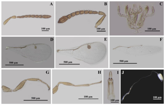 Figure 3F). The humeral plate is white. The submarginal vein is white in the first half to progressively brown in the middle and has a strong brown parastigma. The marginal vein is white with a black spot distally, in the hamuli area. The hamuli are brown. The fore coxa is light yellow, almost white on dried specimens, with short, white, scattered setae with black-dotted setal pores. The fore trochanter is light yellow, almost white on dried specimens. The profemur is light yellow with white, short setae on the interior face, black medium setae on the distal part of the exterior face, and long black setae on the posterior face with black-dotted setal pores on the exterior and posterior faces. The protibia is light yellow with an external longitudinal line of black setae with black-dotted setal pores and short white setae on the other faces. The protibial spur is light yellow. On all legs, the tarsomeres are light yellow, the claws are light brown, the arolium is brown. The mesocoxa is light yellow, almost white on dried specimens, with short, white, scattered setae. The mesotrochanter is light yellow, almost white on dried specimens. The mesofemur and mesotibia are light yellow, both with minuscule white setae on the interior face and small black setae on the exterior face. The mesotibial spurs are light yellow. The hindleg is light yellow. The metacoxa has long, white, scattered setae with black-dotted setal pores on the upper posterior face, medium, white, scattered setae with black-dotted setal pores on the exterior and interior faces. The metafemur has three external longitudinal lines of black setae with black-dotted setal pores. The metatibia has short, black, external setae with black-dotted setal pores and short, white, internal setae. The metatibial spurs are light yellow. The petiole is amber. The gaster is amber dorsally with black transversal wide straps on the second half of gastral tergites 1–6. The lateral sides of the gaster are light yellow. The gastral sternum, including the hypopygium, is light to dark yellow. The gaster is bare, with one transversal subterminal to the median line of the long, hairlike, black setae on gastral tergites 1–6 and few scattered, long, black setae on the distal part of gastral sternum segments. The ovipositor stylet is brown. The ovipositor sheaths are black with black setae. The epipygium is white and the cerci are black, both with white setae.