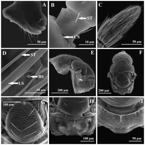 Figure 4I). The maxillolabial complex has sensilla trichodea. The stipes have three sensilla trichodea ventrally. The maxillary and labial palps have sensilla trichodea and campaniform sensilla. The occipital carina is very thin, almost impossible to see on a stereomicroscope but well visible on SEM (