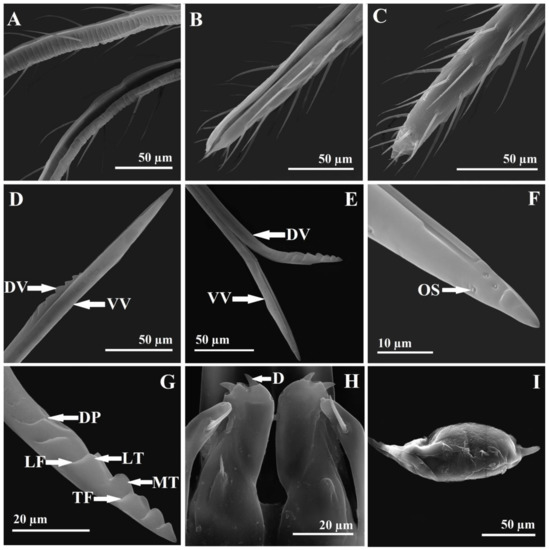 Figure 7A–C). The length of setae is 2.5–3× the width of the sheath. The ventral valve (second valvulae) is smooth, with terminal and subterminal ovipositor (campaniform) sensilla (