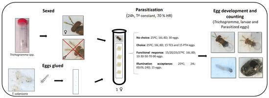 Four “no-choice” (acceptance) bioassays (two with T. achaeae and another two with T. euproctidis on eggs of T. solanivora and P. operculella) were carried out following an adapted version of the methodology described by Gallego et al. (2020) [28] (Figure 1). In each trial, 20 newly emerged, mated Trichogramma females (less than 24 h old) without previous parasite experience and that had previously been provided with a fine line of honey as a food source were individualized in test tubes (7 cm × 1 cm diameter). In order to ensure their complete sexual maturation and acclimatization, the individualized females were subjected to a 24 h period under assay conditions in a climatic chamber (25 °C, 70% RH, with a photoperiod of 16L:8D).