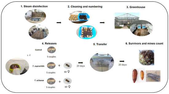 The search ability assay (Figure 2) was carried out under greenhouse conditions in insect cages (45 × 45 × 45 cm). Twenty potatoes (washed and numbered) were placed in 15 L trays and covered with a 5 cm layer of a mixed substrate of orchard soil and lapilli (2:1), previously disinfected with a steam machine (90 °C, 45 min). Three treatments were carried out (control, T. achaeae and T. euproctidis) with four replicates per treatment. Five couples (male and female) of T. solanivora were released in all treatments. The first release of 60 females of T. achaeae and 60 of T. euproctidis was carried out after a period of 48 h in each treatment. To obtain Trichogramma females, T. solanivora eggs developed for eight days at 25 °C were parasitized based on the sex ratio, as indicated in the “Results” section. This procedure yielded 80 and 76 parasitized eggs for T. achaeae and T. euproctidis, respectively. The second Trichogramma release was performed seven days later, with the same number of females of each species. No wasps were released in the control treatment. After a parasitism period of 20 days, the tubers were transferred to plastic boxes for 25 extra days to allow for the emergence of most of the larvae. The mean temperature during the greenhouse assay was 23.18 ± 5.30 °C, whereas the RH was 67.38 ± 16.06%.The evaluation of the assay consisted of counting, damaged tubers, number of mines per tuber and the survival of T. solanivora individuals (larvae, pupae and adults). Additionally, tubers were cut to search for any larvae remaining inside, which were also counted.