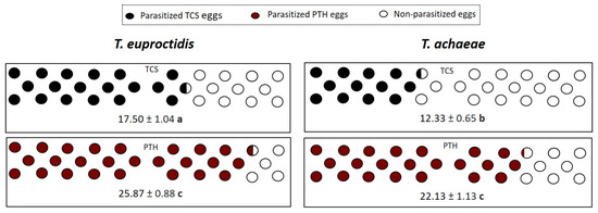 Mean number of parasitized T. solanivora (TCS) and P. operculella (PTH) eggs (±SE) when which are exposed to T. euproctidis and T. achaeae females at 25 °C under 70% RH with 16L:8D. Different letters denote significant differences in the number of parasitized eggs between treatments with different combinations of parasitoids (T. euproctidis or T. achaeae) and egg hosts (p = 0.05).