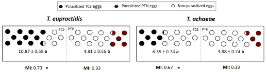 Number of parasitized T. solanivora (TCS) and P. operculella (PTH) eggs (±SE) and obtained Manly Index (MI) when which are exposed to T. euproctidis and T. achaeae females the same time at 25 °C under 70% RH with 16L:8D. Different lowercase letters represent significant differences in the number of parasitized eggs (one-way ANOVA and Tukey’s test; p = 0.05), and “*” indicates significant preference (t-test; p < 0.05) of each parasitic wasp.