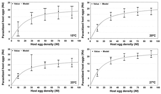Analysis of functional response showed that at all the tested temperatures (15, 20, 25 and 27 °C), the parasitic behavior of adult females of T. euproctidis corresponded with type III. The adjustments showed the lowest values in the corrected Akaike indices (). With respect to the adjustment parameters, the handling times () were similar; on the other hand, the mortality potential () showed similar values at the three highest temperatures (Table 1). The graphs in Figure 5 do not look like the typical “S” curves of functional response type III. It’s because that the inflexion point of the type III curves, from which the parameter “” or parasitoid mortality potential occurs at very low densities of host eggs offered in the species T. solanivora.
