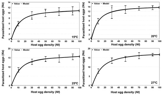 Functional response of T. achaeae female parasitizing T. solanivora eggs at four temperature levels (15 °C, 20 °C, 25 °C and 27 °C) under laboratory conditions (70% RH and 16L:8D). Vertical bars indicate 95% confidence intervals. Note: For a correct interpretation of the figures, it should be taken into account that the y-axis scales may be different.