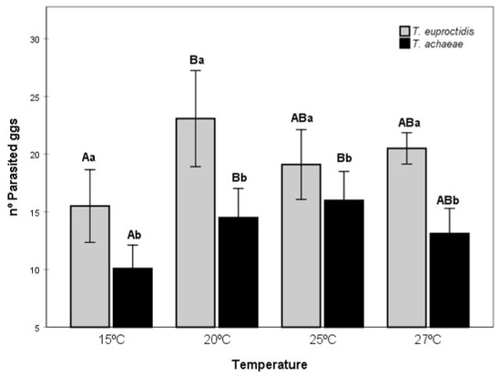 Mean number of eggs parasitized by T. solanivora (±SE) for T. euproctidis compared to T. achaeae at a host density of 90 eggs in the temperature range of 15–27 °C. Different uppercase letters represent differences in the number of parasitized eggs among the tested temperatures in each species. Different lowercase letters indicate significant differences between the two species (two-way ANOVA and Tukey’s test, p = 0.05).