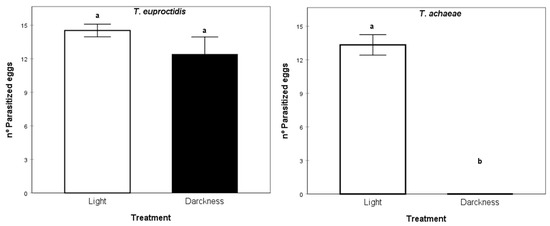 The parasitism activity analysis result did not show significant differences between light and darkness conditions for T. euproctidis (Kruskal–Wallis test, = 125.00, p > 0.05). In contrast, T. achaeae was unable to parasitize the host eggs under darkness conditions (Kruskal–Wallis test, = 210.00, p < 0.05) (Figure 9).