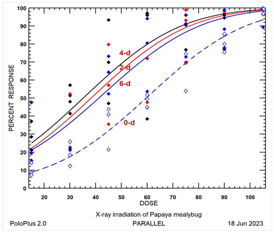 Ionizing radiation, when used for PI treatment, does not result in significant acute mortality at the applied doses. However, it prevents the development and/or reproduction [11,14,15,18,19,20]. In contrast to other phytosanitary treatments like fumigation or cold treatment, the efficacy for PI treatment is not measured based on acute mortality, since acute mortality is not required to prevent the establishment of a pest, and the doses needed to achieve 100% acute mortality are higher than the largest tolerance threshold for most fresh commodities [12,14,17,46]. In order to facilitate the application of PI treatment of P. marginatus, we prefer to choose the effect of radiation on preventing the emergence of 2nd instar nymphs as the end point for efficacy evaluation, rather than neonate (1st instar nymphs) from the irradiated females, even though the oviparous mealybugs lay eggs, since it is difficult to find out all eggs or neonates lurking in the female’s abdomen before irradiation treatment [19,20,27,37,38]. Furthermore, very high radiation doses are required to prevent hatching of ready-to-hatch eggs, for instance, the minimum dose to prevent egg-hatching of Pl. minor Maskell is different from 7–14-day-old and un-oviposited eggs, which are >250 Gy and 150 Gy, respectively [47].