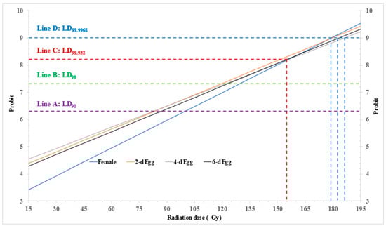 The expected dose-probit lines for 2-, 4-, and 6-day-old eggs demonstrated a roughly parallel relationship. In contrast, the dose-probit line for 0-day-old eggs appeared in a lower position initially and displayed a steeper slope (0.034 vs. 0.026–0.028 for produced eggs) [32,35]. Notably, no intersections were observed at probit-5.0 (LD50), probit-6.28 (line A, LD90), and even at probit-7.32 (line B, LD99). However, the line intersected with the lines for 2- and 4-day-old eggs at approximately probit-8.20 (line C, LD99.932), and the intersection continued until probit-9 (line D, LD99.9968) with the line for 6-day-old eggs (Figure 2).