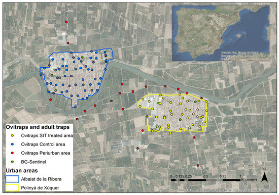 Two target areas were chosen to evaluate the efficiency of IVM based on the SIT as shown in Figure 1. The selected IVM-SIT pilot site was Polinyà de Xuquer, a municipality covering 45 hectares of urban area and 2350 inhabitants. The municipality of Albalat de la Ribera (60 ha, 4312 inhabitants), located less than one km away from the pilot area, was used as a control site. On the control site, larvicide treatments of gutters were performed by the pest control company hired by the city. In contrast, in addition to these treatments managed by the municipality, at the IVM-SIT pilot site complementary control methods, and the release of sterile males were implemented, as detailed below. Both municipalities have urban centers surrounded by citrus groves, with agriculture being the main activity in the area. Irrigated cultivation, together with the presence of scattered houses in the peripheral area, provides an ideal habitat for the establishment of Ae. albopictus. The climate of the region is temperate. As example, the average annual temperature in the area in 2020 was 17.8 °C, with 74.2% relative humidity [20].