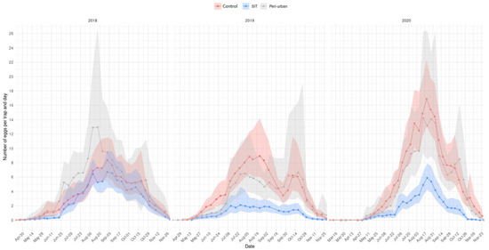 Number of eggs per trap per day in the control (red), SIT (blue), and peri-urban area (gray) from 2018 to 2020. Each marker represents the mean of eggs/trap/day of the last four weeks. The shaded areas represent the 99% confidence intervals for each zone.