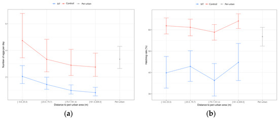 Confidence intervals (95%) of number of eggs per trap per day (a,b) hatching rate (b) as functions to the closest distance to the peri-urban area boundary. The limits of the groups are based on quartiles.