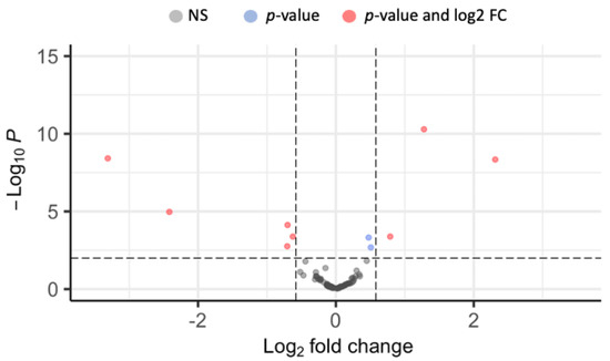 Differential expression of 100 miRNAs in biting Pipiens and non-biting Molestus. Each point represents a single miRNA. Gray points indicate no significant differences in expression. Blue points represent miRNAs with statistically significant expression differences, but low absolute log2 fold-change values. Red points indicate the eight statistically significant differentially expressed miRNAs with an absolute fold change value greater than 1.5. Positive values indicate greater expression levels in biting Pipiens relative to non-biting Molestus.