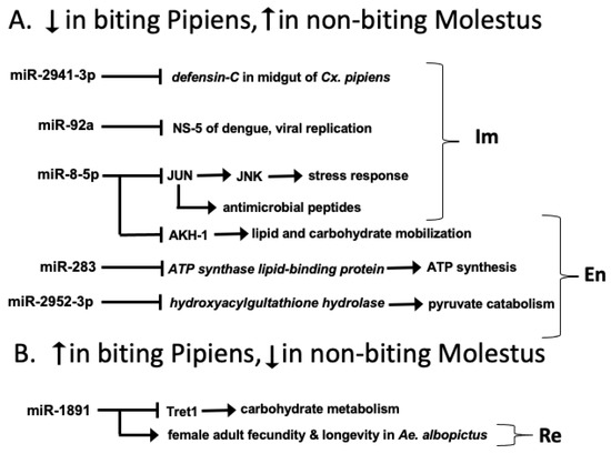 Differential miRNA expression in biting Pipiens vs. non-biting Molestus. (A) microRNAs downregulated (↓) in biting Pipiens and upregulated (↑) in non-biting Molestus; (B) microRNAs up-regulated (↑) in biting Pipiens and downregulated (↓ ) in non-biting Molestus. Im, immune function; En, energy metabolism; Re, reproduction. functions to inhibit; ⟶ functions to stimulate. For example, lower expression of miR-2941-3p in biters relative to nonbiters implies released suppression of defensin-C in biters. See text for further details.