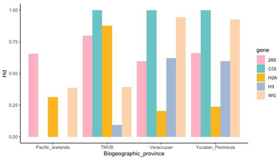 A total of 844 sequences were obtained: 189 for the 28S gene, 177 for the H3 gene, 190 for the H2A gene, 147 for the Wg gene, and 141 for the COI gene (Table S2 in the Supplementary Materials). The haplotype sequences are deposited at GenBank (ID numbers are: OR123974-OR124006 (for H2A), OR124007-OR124028 (for H3), OR124029-OR124058 (for Wg), OR120258-OR120285 (for 28S), and OR120103-OR120156 (for COI)). The diversity indices indicate high genetic diversity in all genes. For example, the haplotype diversities were 0.797 (28S), 0.625 (H3), 0.425 (H2A), 0.874 (Wg), and 0.881 (COI), while the nucleotide diversities were 0.01071 (28S), 0.00342 (H3), 0.00375 (H2A), 0.03121 (Wg), and 0.01807 (COI). The neutrality tests for all genes were statistically significant: the Fu and Li’s F −6.41793 (28S), −3.86732 (H3), −4.04503 (H2A), and −2.85538 (COI), and only the Wg gene was positive (2.36933). Tajima Ds were significant and negative for 28S, H3, and H2A (−2.18358, −1.97102, and −2.34419), while they were positive and significant for the Wg gene (2.81039) and negative and non-significant for COI −1.72698). Figure 3 shows the haplotype diversity of each gene by biogeographic province.
