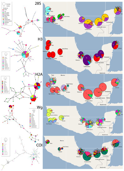 The pattern of the population structure shown by the five genes indicates a genetic break between the western populations (Tepic, Puerto Vallarta, San Patricio, Colima, Santa Teresa, and Zacapu) and the southeastern populations (Veracruz, Coatzacoalcos, Ciudad del Carmen, Champoton, and Cancun). The geographical distribution of each of the haplotypes reflects this break. In addition, the SAMOVA values match this break since FCT reaches higher and more significant values in different clusters depending on the gene, but the populations belonging to these two groups were always kept separate: west and southeast. Each genetic marker gave us a higher FCT value when grouping different populations (Table 2). The 28S gene: K = 6 with FCT = 0.8108 (p-value = 0.000); H3 gene: K = 9 with FCT = 0.55096 (p-value = 0.00880); H2A gene: K = 2 with FCT = 0.67267 (p-value = 0.09677), Wg gene: K = 2 with FCT = 0.58272 (p-value = 0.00098); and COI gene: K = 3 with FCT = 0.81407 (p-value = 0.00293).
