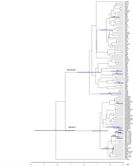 The phylogenetic analyses of the four nuclear genes estimated by Bayesian inference show a clear division between the haplotypes belonging to these two groups (Figure 5). The lnL value was −4785.16 with an effective sample size of 2273. It should be noted that the tree was rooted using the species Membracis luizae and the lineages of M. mexicana were divided into the populations of the west (in red) and the populations of the southeast (in blue). The phylogenies estimated for each gene also produce the same pattern (see Supplementary Materials, Figures S16–S20). For the COI (Figure S16) and Wg (Figure S17) phylogeny, we were able to include more sequences from the GenBank of the distribution of M. mexicana outside of Mexico (two individuals: one from Guatemala and the other from Panama) and one individual for each of the other three species (M. trimaculata, M. flava, and M. foliata).