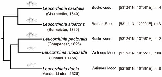 Phylogeny of five European Leucorrhinia species modified from Hovmöller and Johansson []. Fish and dragonfly larvae symbols indicate the preferred top predator (fish predator and large invertebrate predator, respectively) for each species. Sample locations and the number of egg clutches collected are given for each species.