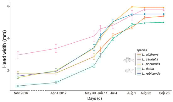 Larvae were measured from November 2016 to September 2017 (December 2016 to March 2017 were excluded because they barely grow during this cold period). For each time point, we counted the number of larvae. Head and lateral spines on segment 8 and 9 of the abdomen were photographed for each larvae using an Olympus digital microscope SZX16 (Hamburg, Germany). We could only measure lateral spines by photographing larvae from above, because early larvae do not survive when handled with forceps to put them into the correct position. We concentrated on lateral spines and excluded dorsal abdominal spines because larvae do not cope well with the necessary handling for photographing the dorsal site at an early stage. We used photos to measure head width and lateral spines in segments 8 and 9 with the free software ImageJ 1.50 g (National Institutes of Health, Bethesda, MD, USA 2016). Head width was used as a surrogate for body size [].