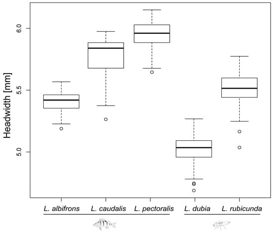 Head width of last instar larvae for all 5 Leucorrhinia species. Fish and dragonfly larvae symbols indicate the preferred top predator (fish predator and large invertebrate predator, respectively) for each species.