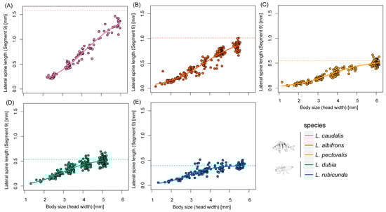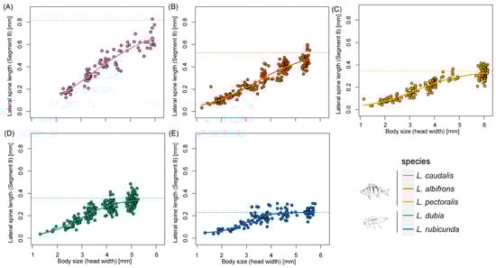 Scaling relationships of lateral spine length in segment 8 and body size during larval developing time. (A–E) represent different Leucorrhinia species, which are shown with different colors.