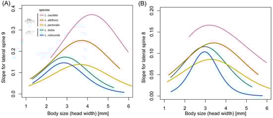 Slopes of the scaling relationship curves of lateral spine length and body size during larval developing time in 5 Leucorrhinia species. (A) Lateral spines in segment 9 and (B) lateral spines in segment 8.