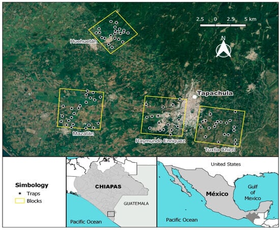 The evaluation was carried out in blocks of approximately 5000 ha separated by distances between 5 and 10 km. The blocks were distributed throughout the mango-growing area of the Soconusco Region, Chiapas, which mainly includes the municipalities of Huehuetán, Mazatán, Tapachula, and Tuxtla Chico. The working area was basically established in the coastal plain of the Soconusco Region, which has an Am climate type according to Köpen and Geiger, with a mean temperature of 24.8 °C and a mean annual rainfall of 3843 mm. Sterile flies and parasitoids have been released weekly in the region since 2013. The evaluations of Anastrepha fly population and parasitism levels were carried out in 2014 in four different blocks, where a specific treatment was applied during this period. Figure 1 shows a map with the geographic distributions of the four blocks. The satellite image gives an idea of the landscape ecology and vegetation cover. The characteristics of each block are described below: