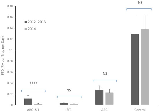 Flies per Trap per Day (FTD) values of A. ludens in the blocks with different treatments. Lines above bars indicate the S.E., **** = statistical difference and NS = non-statistical difference between periods in each block, Student’s t-test.
