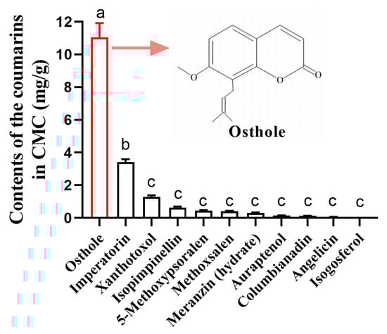 Contents of the coumarins in CMC. Different lowercase letters indicate significant differences among coumarins (one-way analysis of variance (ANOVA), followed by multiple comparisons of Tukey’s test, p < 0.05). Error bars represent standard error (n = 4).