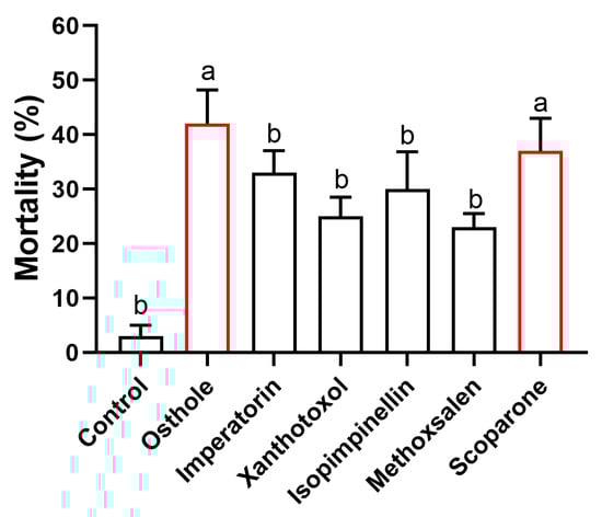 The mortality rates of the adult T. urticae varied between 23% and 42% across all six coumarins investigated (Figure 2). It is noteworthy that both osthole and scoparone exhibited significantly higher mortality rates compared to the remaining coumarins. Specifically, osthole treatment resulted in a mortality rate of 42%, while scoparone treatment led to a mortality rate of 37%.