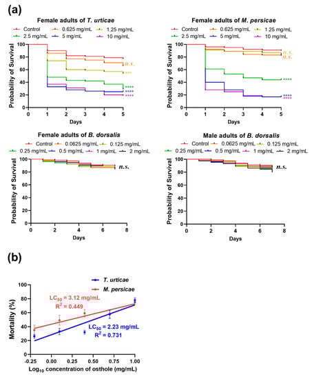 The acute toxicity of osthole against T. urticae, M. persicae, and B. dorsalis. (a) Kaplan–Meier survival curve of adults from the three pest species upon exposure to osthole (n = 20). The asterisk indicates a statistically significant difference measured using Log-Rank test as compared to the wild type (***, p < 0.0005; ****, p < 0.0001; n.s., not significant). (b) Concentration–mortality lines for the mortality of T. urticae and M. persicae nymphs after osthole exposure (n = 5 for T. urticae, n = 6 for M. persicae). Error bars represent standard error.