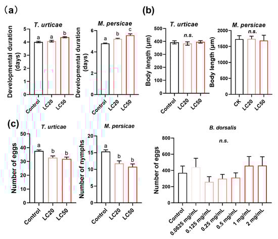 Effects of osthole treatments on the developmental period (a), body length (b), and reproduction (c) of T. urticae, M. persicae, and B. dorsalis. Different lowercase letters indicate significant differences among treatments (one-way analysis of variance (ANOVA), followed by multiple comparisons of Tukey’s test, p < 0.05). n.s. indicates not significant. Error bars represent standard error.